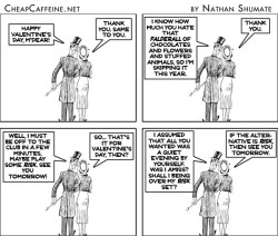 To the presumed delight of many, CheapCaffeine has now been updated with a visual archive which will allow those searching for a particular cartoon to do so more easily than click the back arrow time after time after time. The permanent link is at the top of the sidebar to the right (a more appealing graphic will likely supplant the unadorned text in the near future).